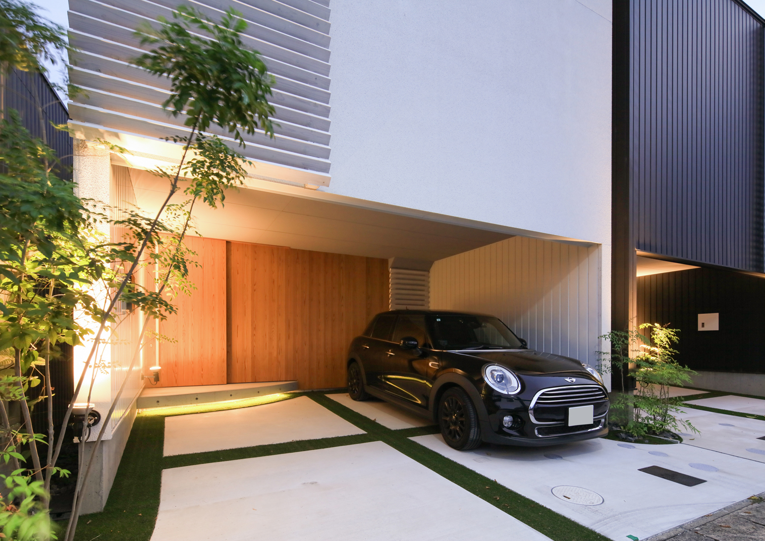 【雨の日も濡れずに乗り降りできるガレージ。エントランスの間接照明も印象的です。】